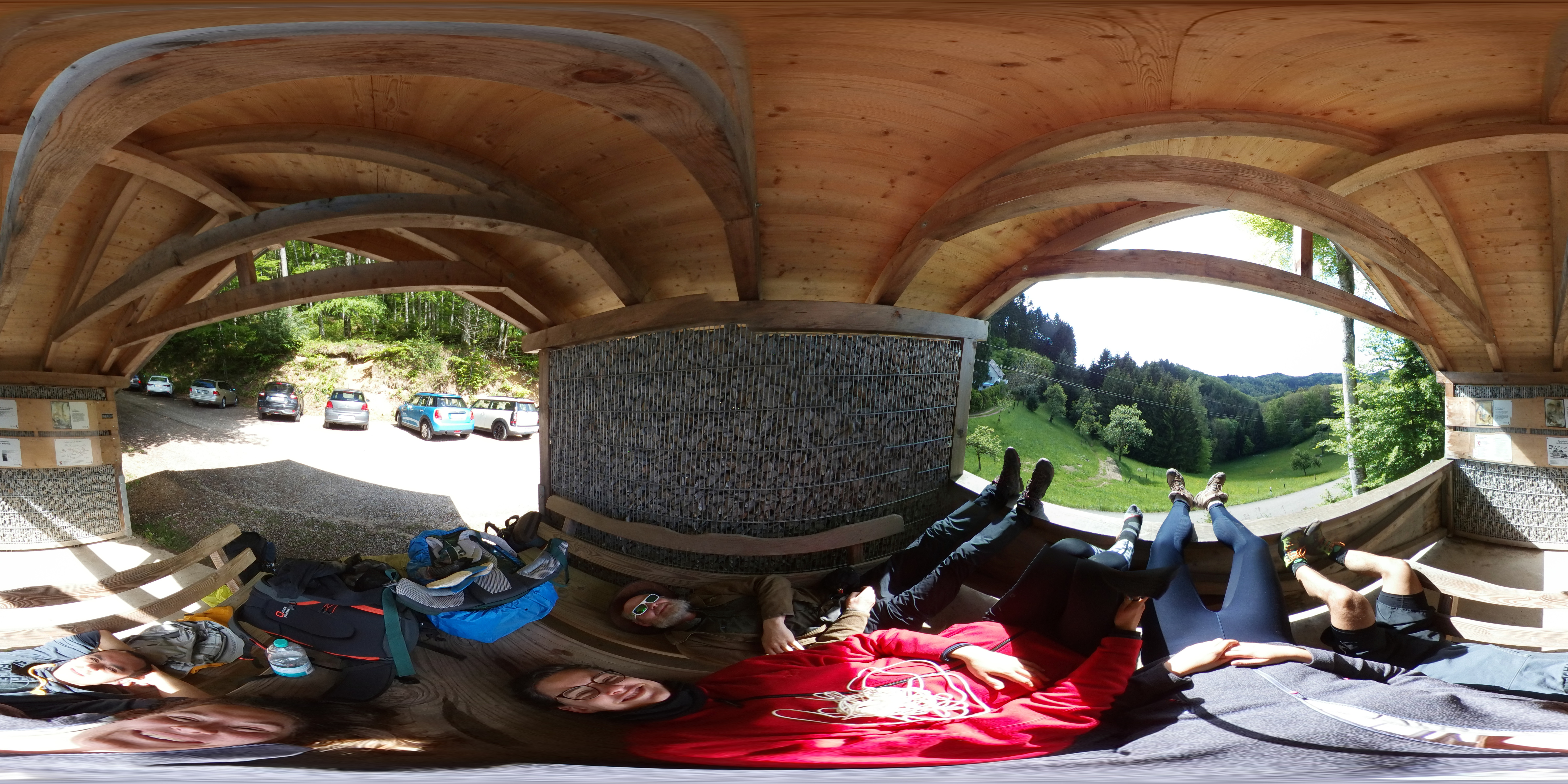 Die grüne Bank verschmähen wir, aber in der neuen Hütte am Lindenbückle lassen wir uns noch mal kurz nieder.
